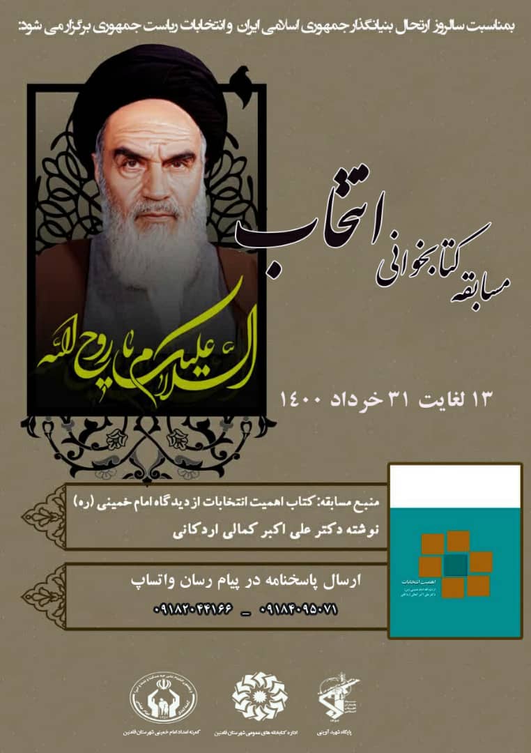 مسابقه کتابخوانی انتخاب از کتاب اهمیت انتخابات از دیدگاه امام خمینی ( ره) بمناسبت سالروز ارتحال بنیانگذار جمهوری اسلامی ایران و انتخابات ریاست جمهوری اداره کتابخانه های عمومی شهرستان با همکاری کمیته امداد امام خمینی ( ره) و پایگاه شهید آوینی شهرستان برگزار می نمائید.